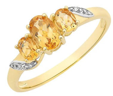 Elizabeth is crafted in 9ct Yellow Gold and this beautiful Dress Ring showcases the crisp yellow hues of Citrine; the birthstone gem for November. At the Centre is a trilogy design with Oval natural Citrine Gemstones all set with 4 claws, complimented with a small ribbon that has been bead set with a white diamond & rhodium plated. The ring has a half round plain polished yellow gold band that tapers from 2.2mm back to 1.65mm at the back.