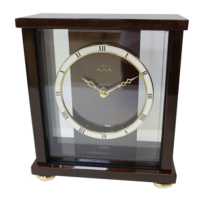 The Adina Mantle Clock Cl22-J8845 Is A Refined Timepiece That Combines Traditional Craftsmanship With A Sleek, Modern Design. Crafted From Lacquered Timber And Glass, It Features A Classic White Dial With Black Roman Numerals, Offering A Timeless Aesthetic Suitable For Various Interior Styles. This Clock Operates On A Quartz Movement Powered By A Single Aa Battery, Ensuring Accurate Timekeeping Without The Need For Winding. Its Dimensions Are Approximately 18 Cm In Height, 20 Cm In Width, And 9 Cm In Depth, Making It Suitable For Placement On Mantels, Desks, Or Shelves