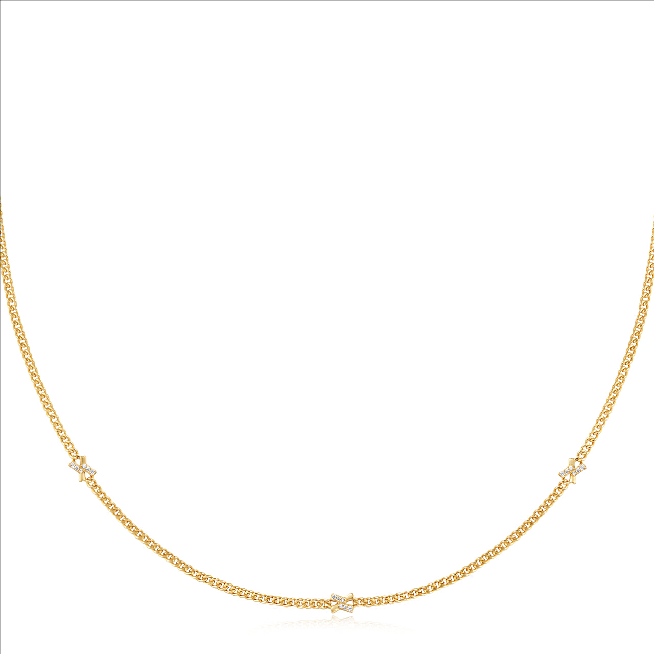 The Ania Haie Gold Cross Station Necklace is a stylish piece that combines link chains with cross stations, offering a blend of classic and contemporary design. Crafted from 925 sterling silver with 14kt gold plating and adorned with cubic zirconia stones, the necklace measures 38 cm in length with an additional 5 cm extender, totaling 43 cm. Each cross charm measures 4.5 x 4.2 mm, and the necklace weighs approximately 5.8 grams