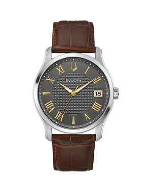 From the Bulova classic collection, this watch features a brushed silver-tone stainless steel case set with a grey 3-hand dial with a clous de paris intricately textured detail, calendar, polished Roman numeral markers, and a domed crystal. The smooth brown leather strap fastens with a deployant buckle with pushers for easy release.