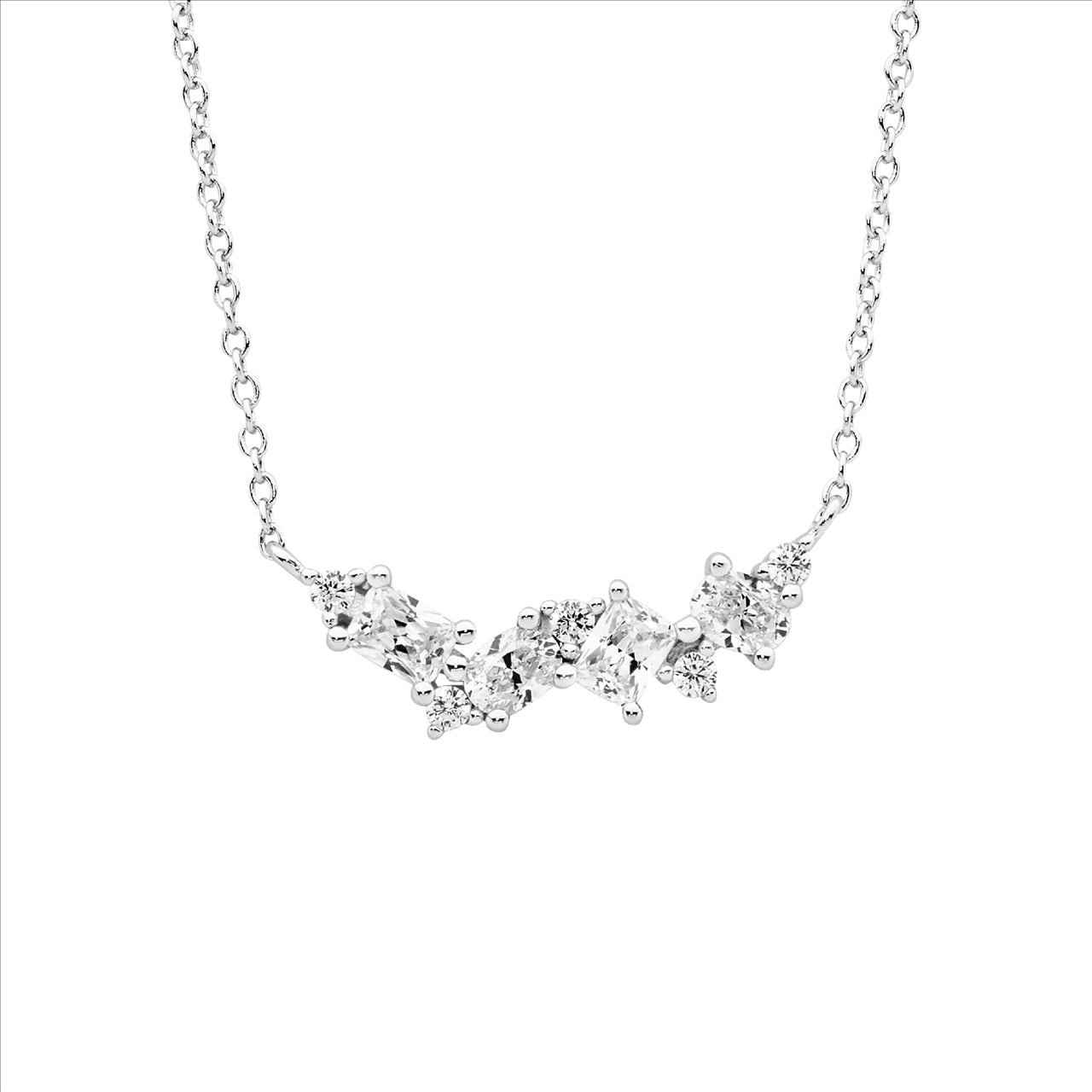 Elevate your style with this stunning Ellani Sterling Silver Necklace, featuring a captivating multi-shape cluster of white cubic zirconia stones that shimmer from every angle. Delicately designed on a 40cm chain with a 5cm extender, this piece sits perfectly at the neckline, making it ideal for both layering and stand-alone elegance.