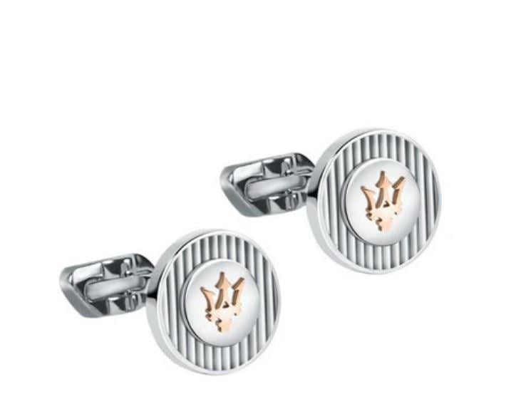 The Maserati Jewels Stainless Steel Cufflinks (Model JM121ATK14) are a distinguished accessory for men, reflecting the brand's commitment to luxury and style. Crafted from high-quality stainless steel, these cufflinks feature a sleek silver finish accented with rose gold elements, embodying a sophisticated aesthetic. Each cufflink measures 15x3 mm, with a button length of 3 mm, and is secured with a reliable buckle clasp