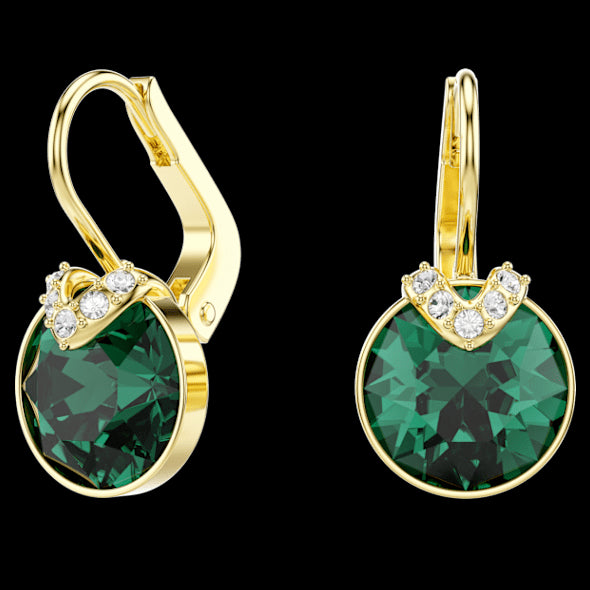 Infuse some color into your everyday wardrobe with this captivating pair of pierced earrings. Each gold-tone plated piece is brought to life with a round-cut crystal in green, creating a look of pure joy. A perfect choice for your day-to-night styling, these earrings can be worn together with a matching green pendant.