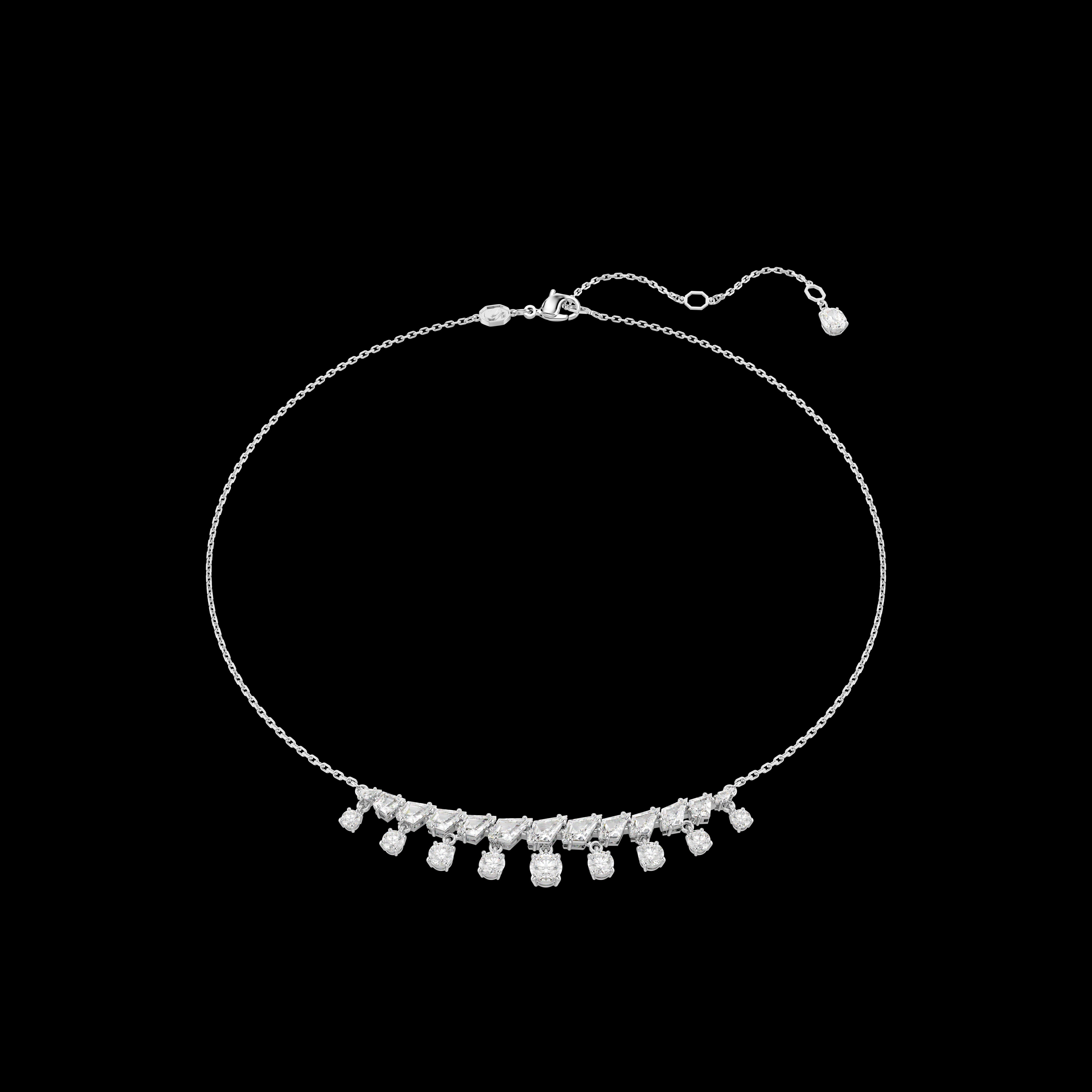 Illuminate any look with this radiant ice-inspired necklace. The rhodium plated design features a gradient of clear kite-shaped Swarovski Zirconia, each adorned with a round-cut Swarovski Zirconia that hangs beneath. Completed with a lobster closure, this wintry piece is a perfect example of Swarovski’s precision cutting and mastery of light. Wear it alongside a pair of snowflake earrings from the same Idyllia family