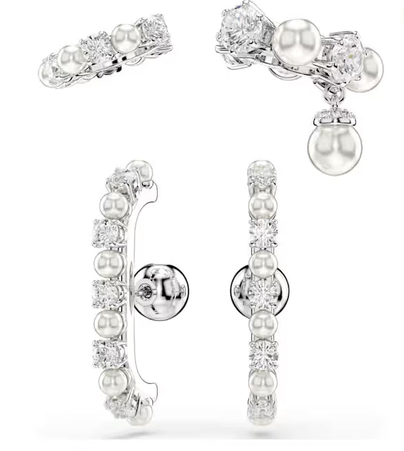 These stunning pieces multiply the elegance by four. The full set of two pierced earrings and two ear cuffs is rhodium plated and crafted with a variety of round Swarovski Zirconia and Swarovski Crystal Pearls, all combining to make a modern yet captivating impression. Play with the positioning to create a look that expresses your own personal style.
