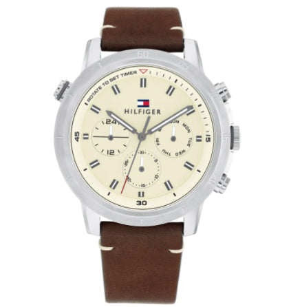 Tommy Hilfiger Dark Brown Leather Parchment Dial Multi-function Men's Watch - 1792102