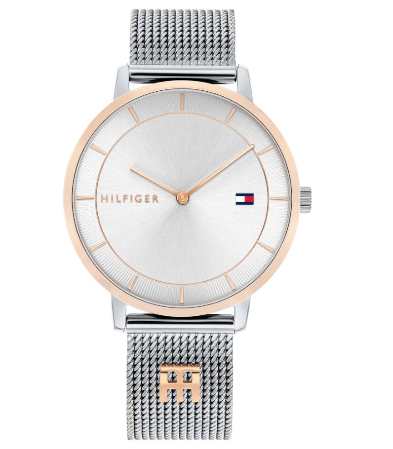 Experience the time-keeping excellence of this Quartz-based Tommy Hilfiger Tea Silver Mesh Ladies Watch. Its 35mm two-tone Stainless Steel case, surrounded by a Mineral crystal, proudly houses a bright White dial. Securely fastened with a 16mm-wide Stainless Steel strap and a Sliding Buckle clasp, the watch is shaped to be comfortable and resilient to up to 3 Atm of water resistance.