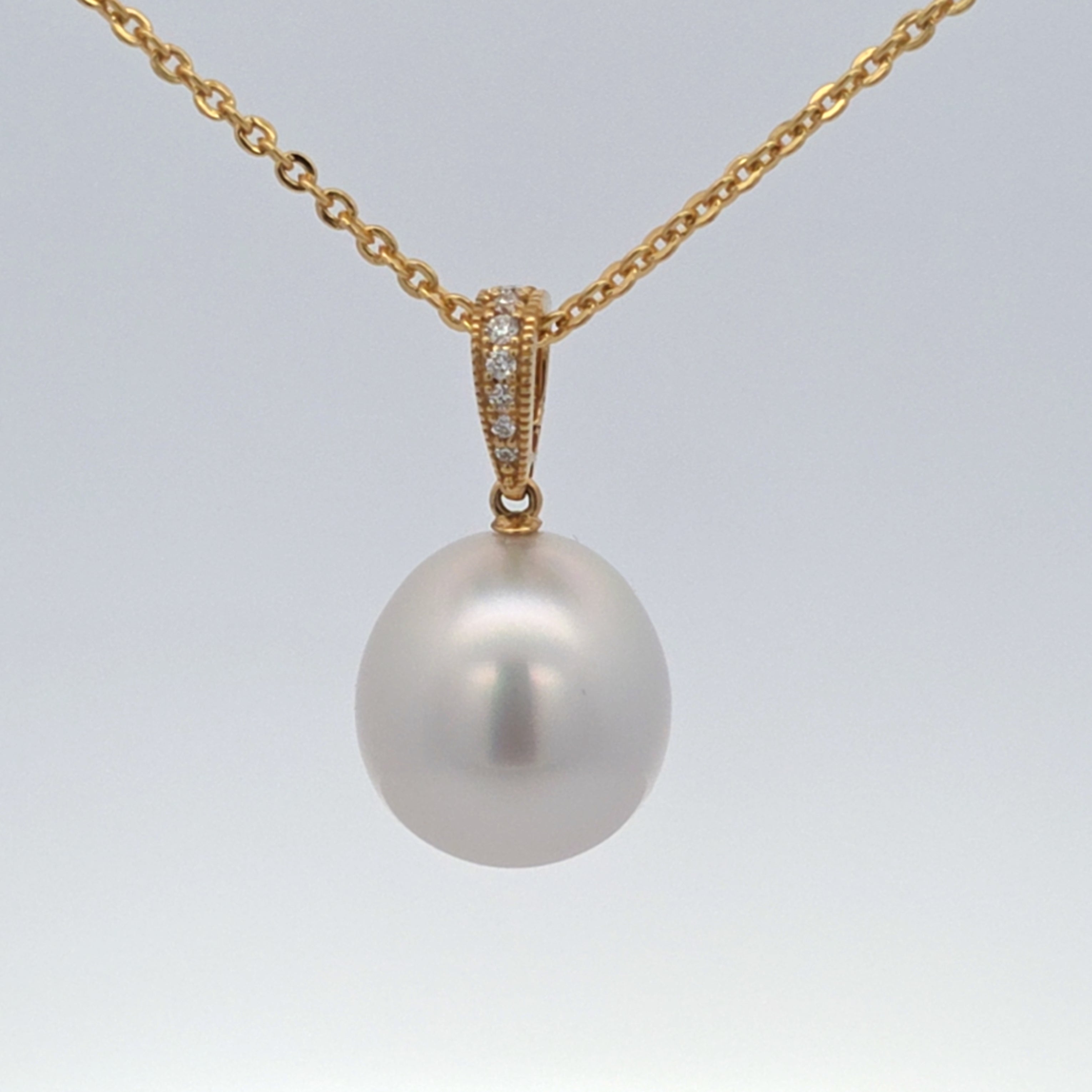 18k Yellow Gold Diamond & Autore South Sea Pearl 12mm Oval White Pendant