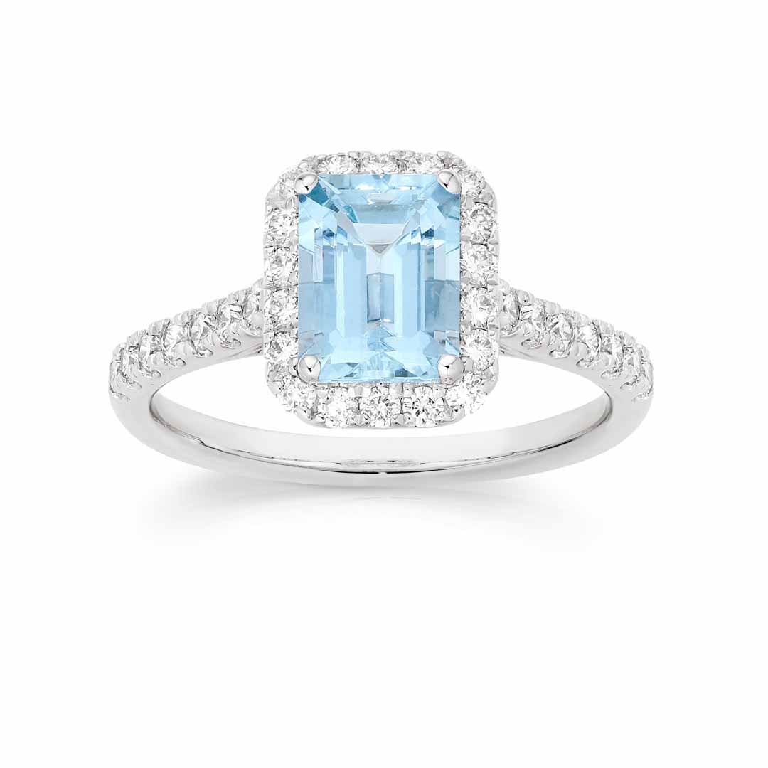 18ct White Gold Aquamarine & Diamond Emerald Cut Halo Ring