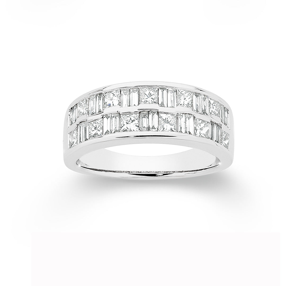 18ct White Gold Princess & Baguette Diamond Double Row Ring TDW=1.30ct HI/SI