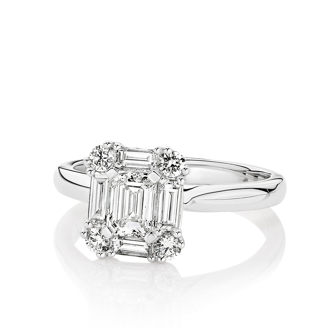 18ct White Gold Diamond Emerald, Baguette & Round Brilliant Cut Ring