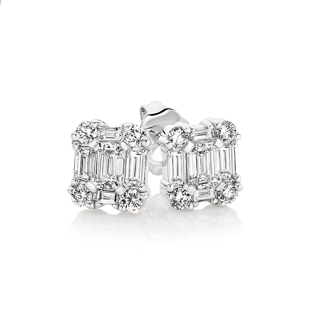 18ct WG Diamond Emerald, Baguette & Round Brilliant Cut Stud Earrings TDW=0.90ct G/SI