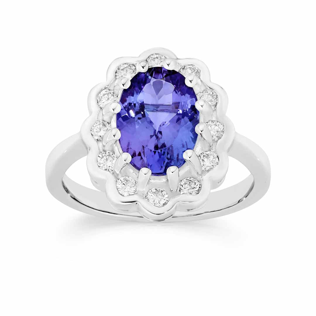 18ct White Gold Tanzanite & Diamond Oval Scalloped Frame Ring