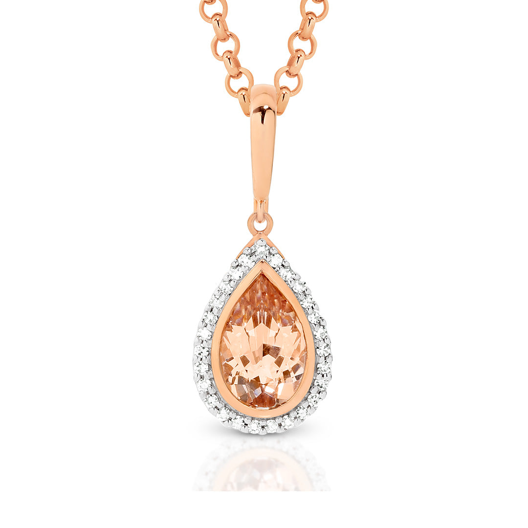 9ct Rose Gold Morganite & Diamond Pear Cut Halo Pendant