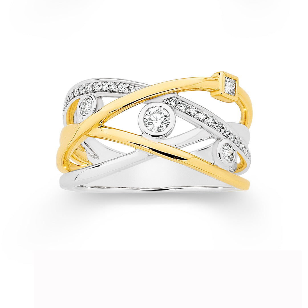 9ct WG/YG Diamond Crossover Bezel Set Wide Ring TDW=0.35ct JKL/SI3