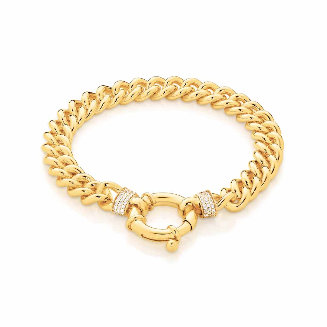 9ct Yellow Gold Silver Filled 19cm Curb Bolt Ring Bracelet with CZ