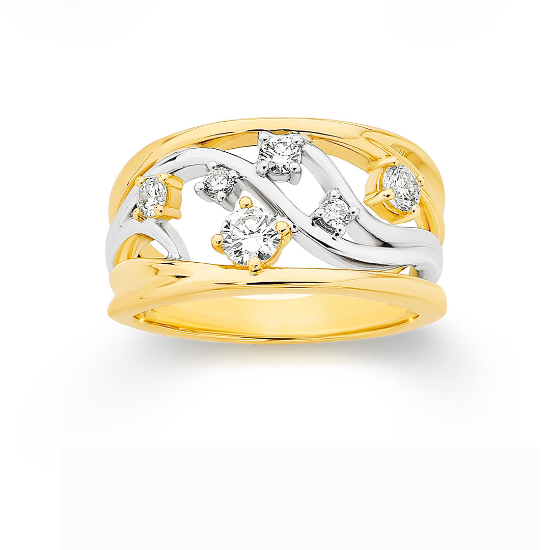 9ct YG/WG Diamond Round Brilliant Cut Claw Set Swirl Wide Band TDW=0.50ct JKL/SI3
