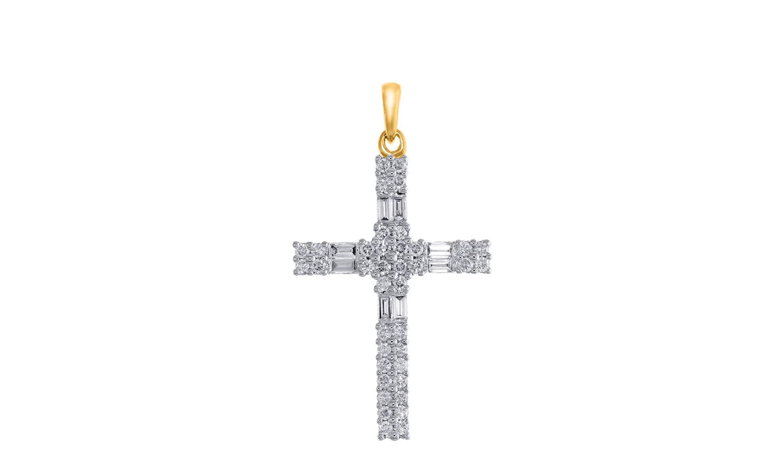 A Timeless Symbol Of Faith And Elegance, This Cross Pendant Is Finely Crafted In 9Ct Yellow Gold And Set With A Brilliant Combination Of Round And Baguette Diamonds.