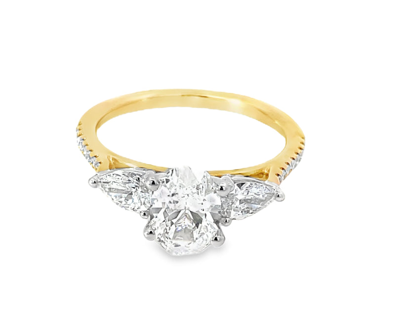 Introducing the stunning Lab-Grown 18ct Yellow Gold Oval Diamond Engagement Ring, a true symbol of timeless love and commitment. Featuring a breathtaking 1.04ct certified oval-shaped center diamond, this elegant ring is flanked by two pear-cut diamonds on each side, adding to the total diamond weight (TDW) of 1.58ct. The band is adorned with sparkling round brilliant-cut diamonds, which enhance the overall brilliance and luxury of this exceptional piece.