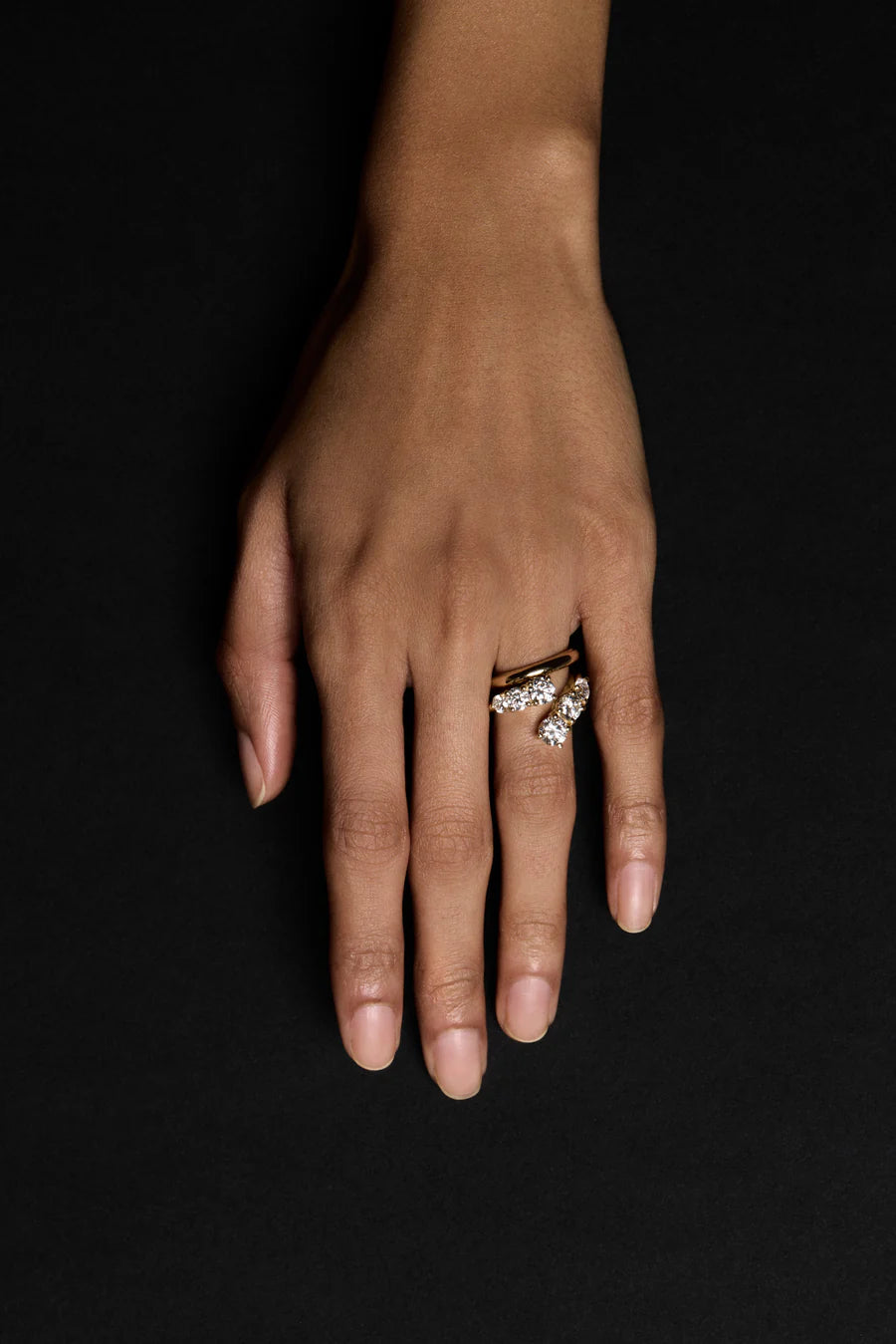 Six dazzling round brilliant cut lab grown diamonds are gracefully arranged in a wrap-style design, creating fluid movement and exceptional sparkle across the finger. With a total diamond weight of 1.52ct, each diamond displays outstanding D colour and VS clarity for remarkable brightness and fire.
