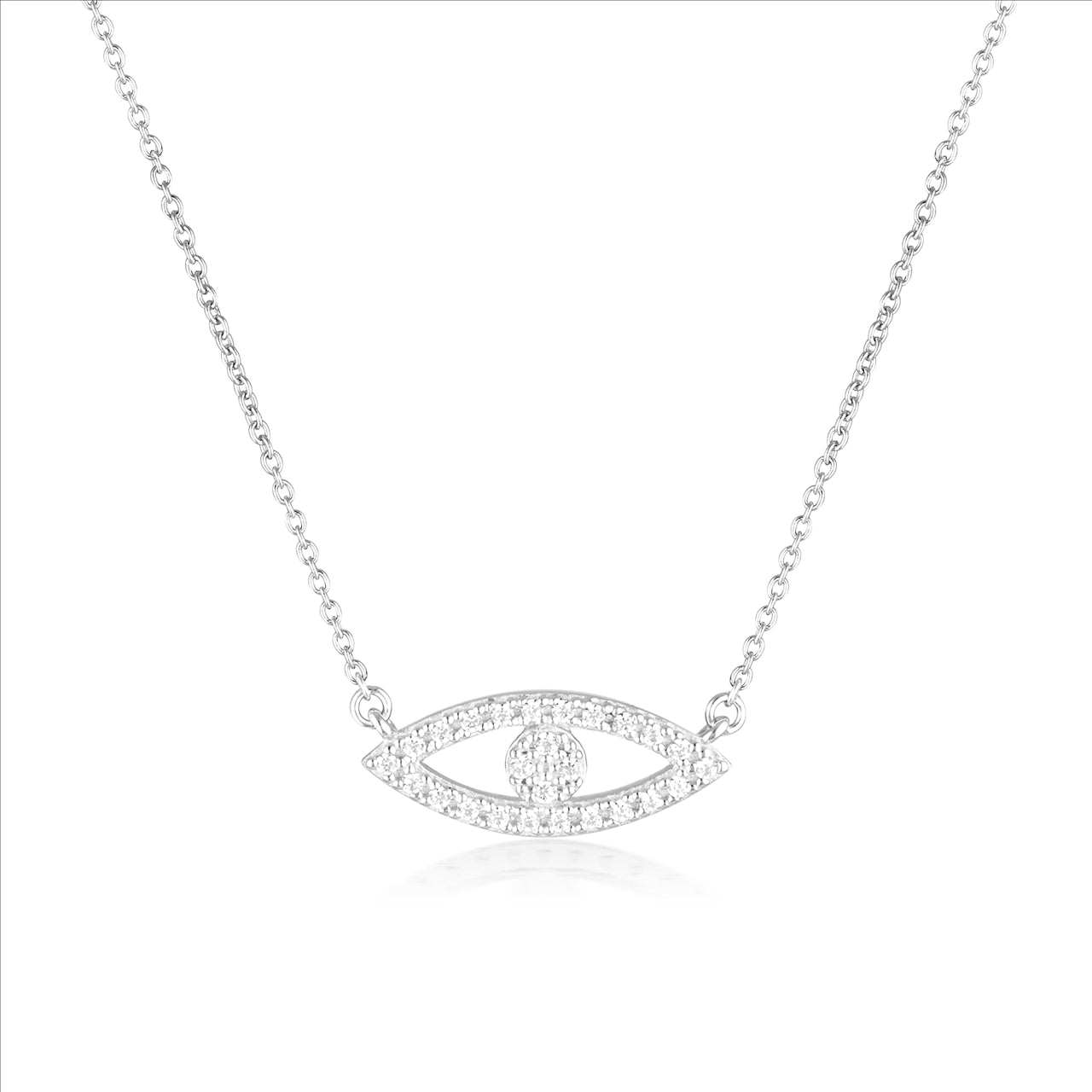 The Evil Eye pendant in silver by Georgini is a fashion edit on the ancient symbol for protection from negative energy. Subtle and sleek this piece features 26 sparkling stones perfectly set into this beautiful talisman. Team it with the Evil Eye earrings and bracelet for an on trend set this season. Crafted in luxurious rhodium plated Sterling Silver it measures approximately 15mm wide and is set on a 41cm chain with a 5cm extension.