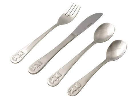 This sweet four piece set will inspire the toddler to use cutlery at meal times with its easy lightweight feel and teddy bear design. The set comprises a fork, spoon, knife and teaspon with a raised teddy bear at the base of the handles.