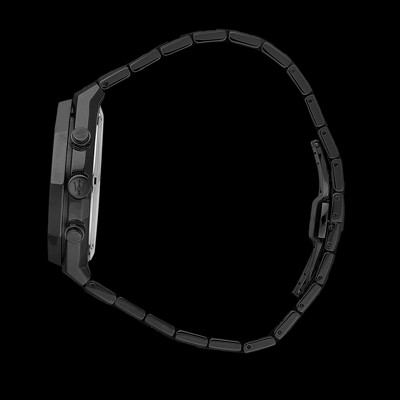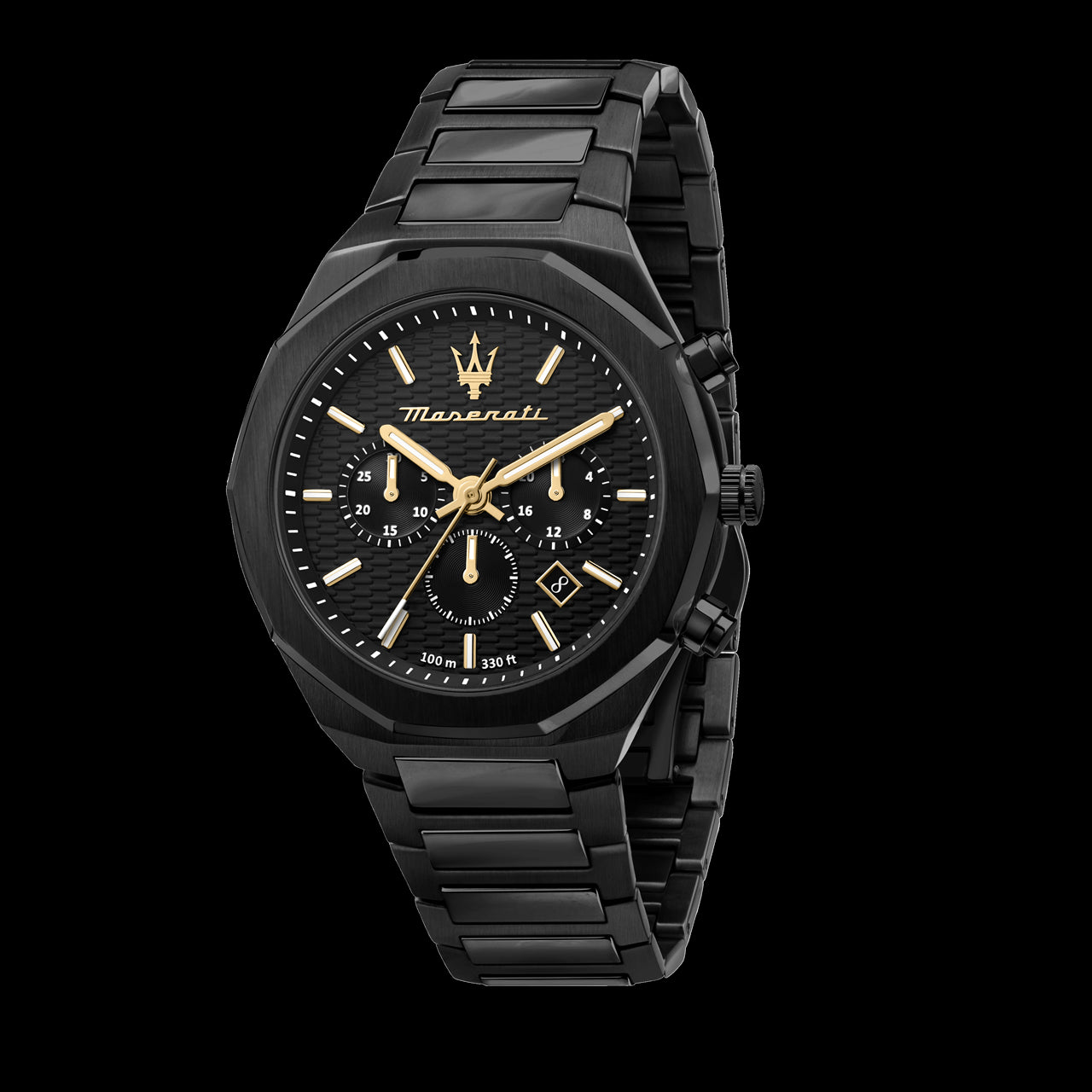 The Maserati 'Stile' watch features a black stainless steel band with 45mm case, round black dial with gold accents and date between 4 & 5. 2 Year Warranty. 100 metre water resistant. Suitable for swimming, snorkelling but not diving. You should not wear your watch in a hot shower. SPECIFICATIONS Band Colour Black Band Material Metal Bezel Colour Black Case Colour Black Dial Colour Black & Gold Dial Shape Round Display Analogue Glass Mineral Crystal Movement Quartz