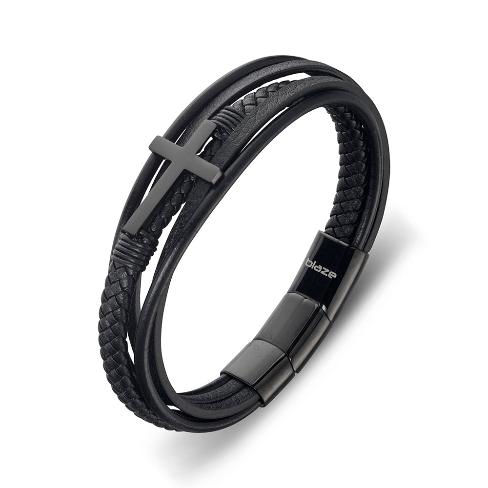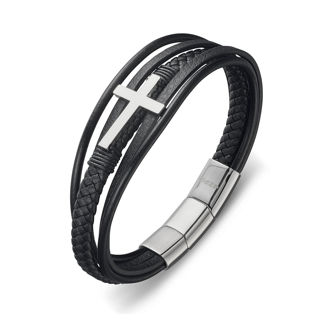 Men’S Leather Bangle, Black Leather Bracelet, Stainless Steel Cross Bracelet