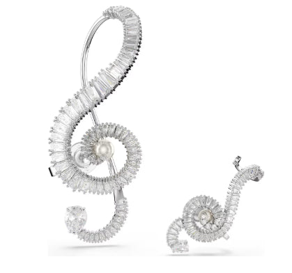 These music-inspired clip earrings will inject any outfit with rhythm and light. Taking the form of a treble clef in two different sizes, each piece is elegantly tapered and set with baguette-cut Swarovski Zirconia and a single Swarovski Crystal Pearl placed at the center.
