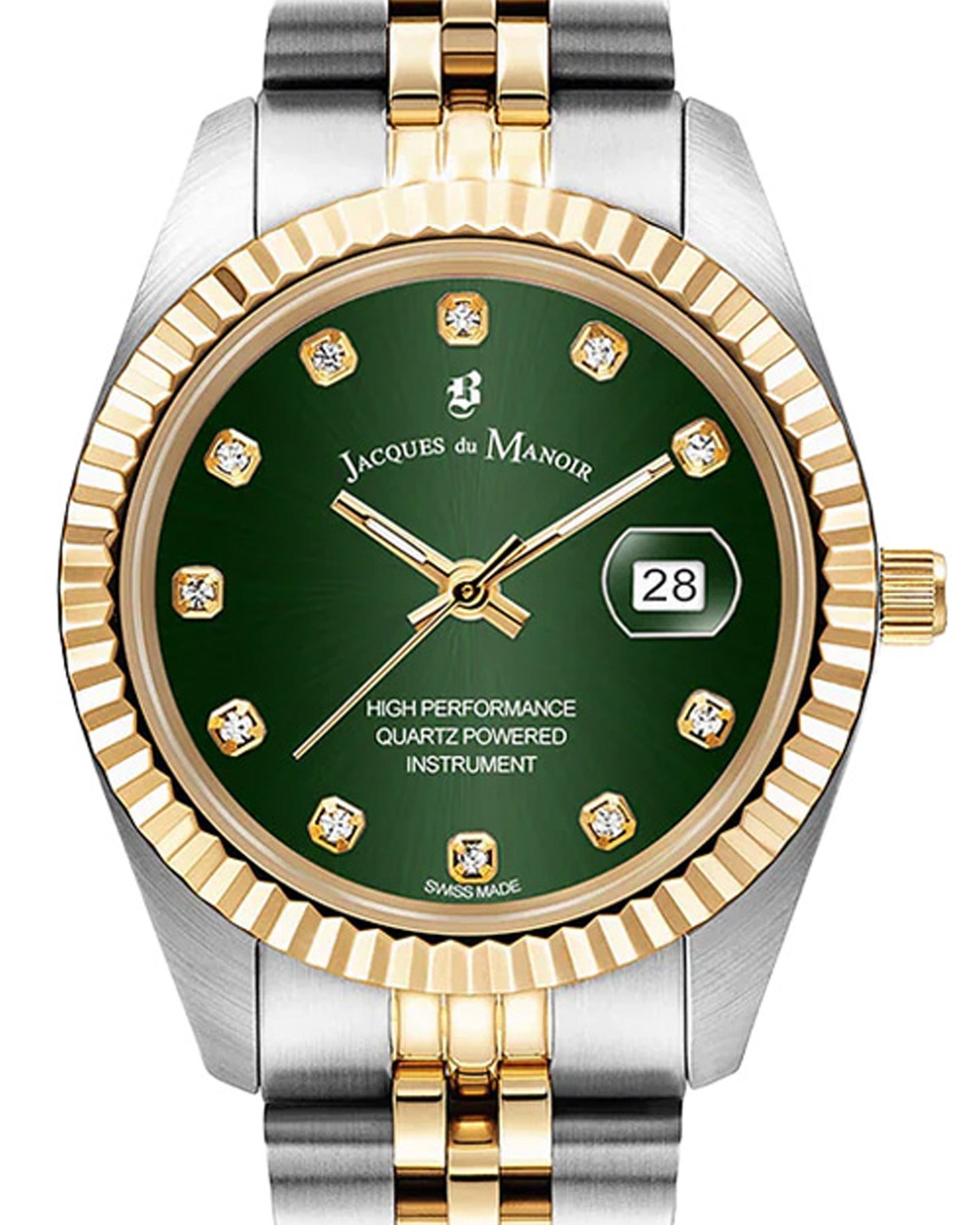 he Jacques Du Manoir Inspiration 31mm Green Dial Two-Tone Stainless Steel Bracelet Watch (model JWL01206) is a Swiss-made timepiece that elegantly combines classic design with modern aesthetics. Its distinctive green sunray dial and two-tone bracelet make it a standout accessory for various occasions.