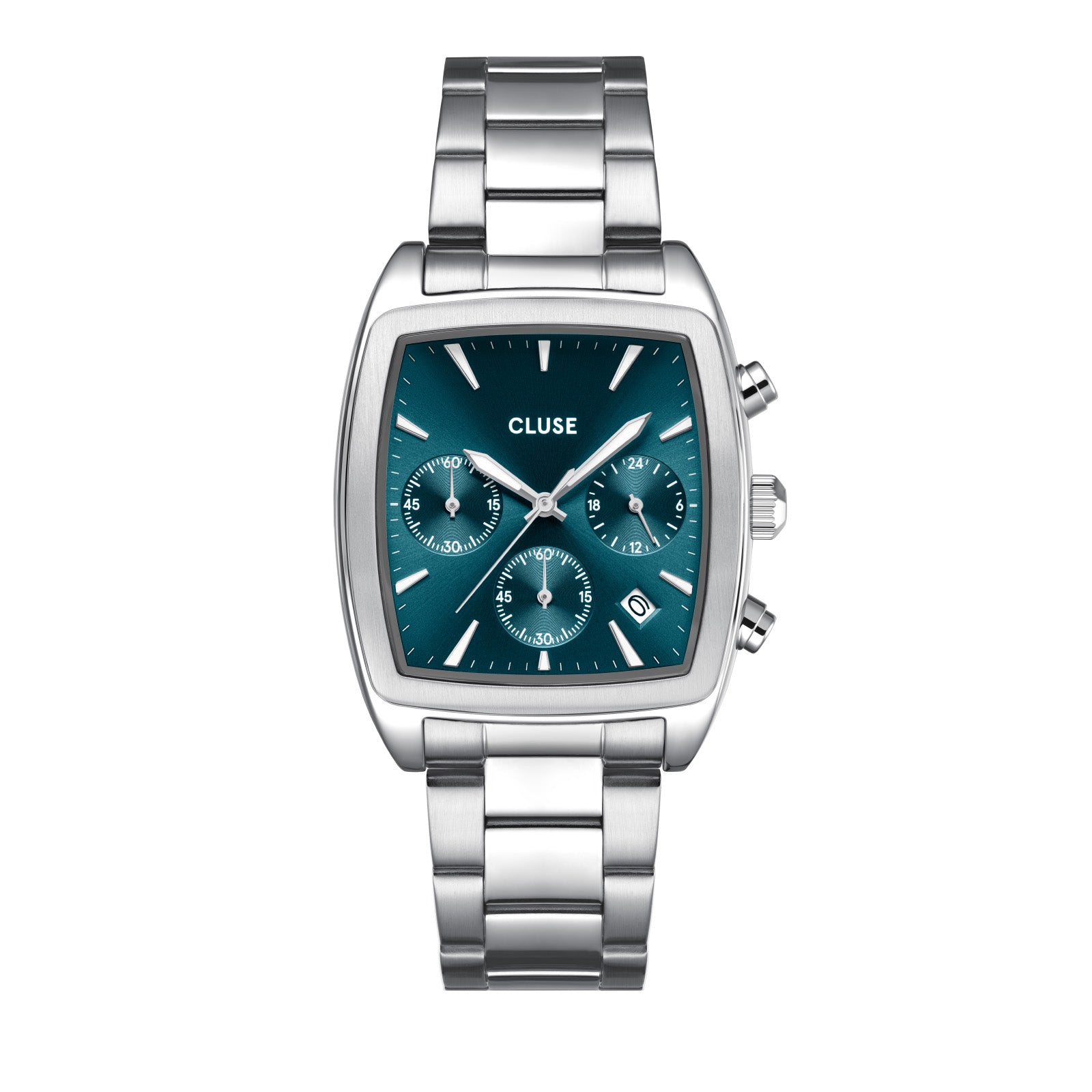 The Quartaut Chrono watch for men boasts a distinctive blend of strength and luxury. Featuring a streamlined silver coloured tonneau case, stainless steel 3-link strap and a blue dial with 3 subdials. Sculpted to perfection, offering both comfort and style. To adjust the strap, we recommend visiting your local jeweler.