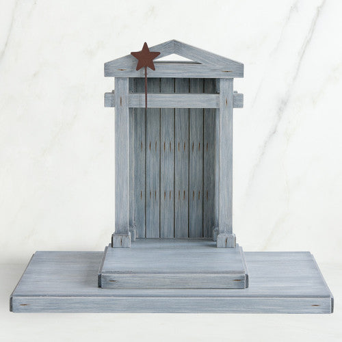 Antiqued blue-gray wood backdrop and base. Center vertical portion has cross beams and rusted nail marks. Larger and smaller base fit together for tiered display. Size and scale complements the Nativity collection